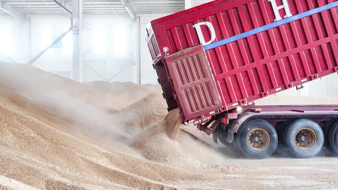 滿載小麥的貨車(chē)正有序駛?cè)?/p>