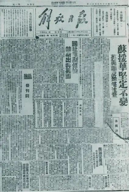 圖為1941年5月16日在延安創(chuàng)刊的中共中央機(jī)關(guān)報(bào)《解放日?qǐng)?bào)》。