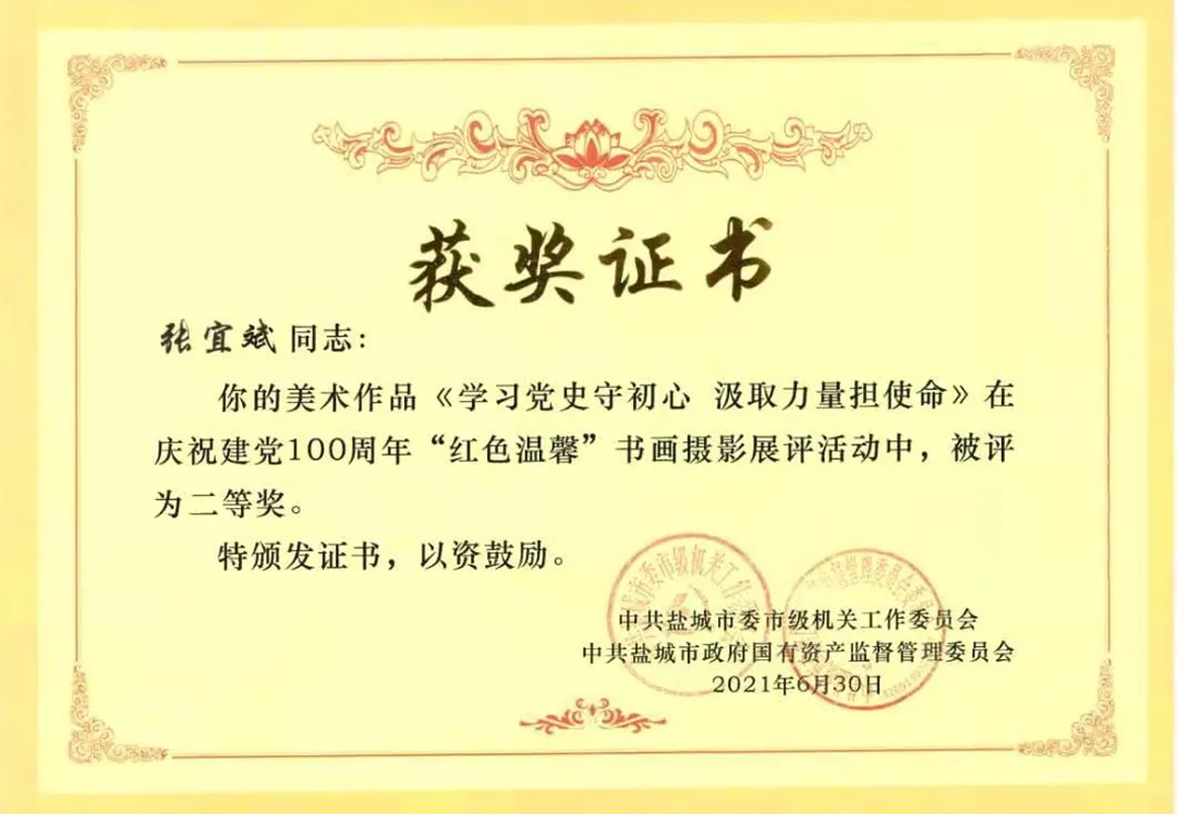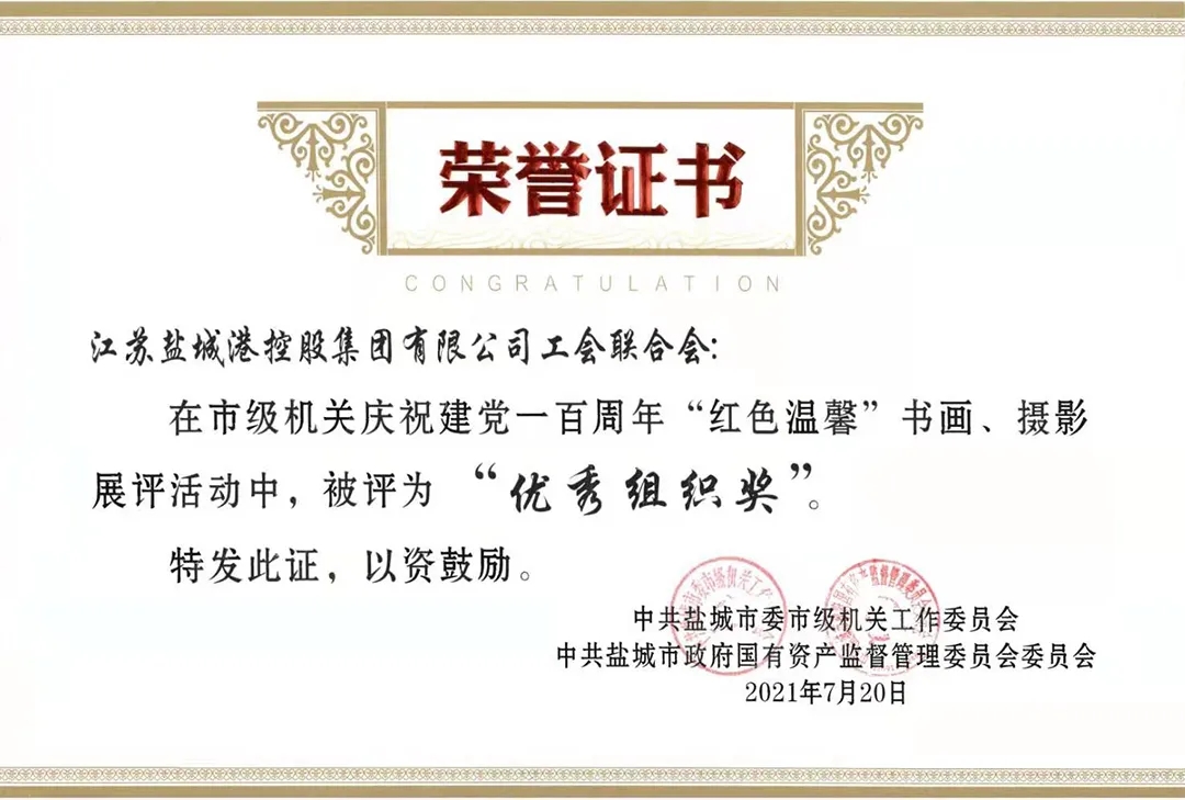 近日,中共鹽城市委市級機關工作委員會與中共鹽城市政府國有資產監督管理委員會委員會發布《關于市級機關慶祝建黨一百周年“紅色溫馨”書畫攝影展評活動的表揚通報》,江蘇鹽城港控股集團有限公司工會聯合會榮獲“優秀組織獎”,響水港區張宜斌同志獲得“美術作品類 二等獎”。