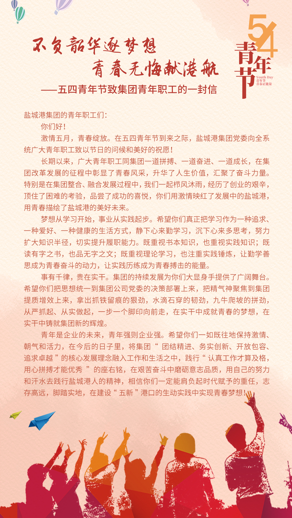激情五月,青春綻放。在五四青年節(jié)到來之際,鹽城港集團(tuán)黨委向全系統(tǒng)廣大青年職工致以節(jié)日的問候和美好的祝愿!