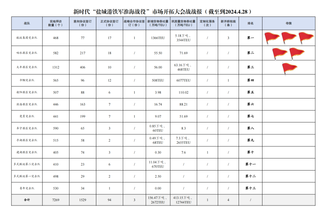 3.簽訂正式協(xié)議數(shù)量94份:其中響水港區(qū)突擊隊(duì)18份,航運(yùn)集團(tuán)突擊隊(duì)17份,巾幗突擊隊(duì)12份,大豐港區(qū)突擊隊(duì)10份,黨員突擊隊(duì)7份,濱海港區(qū)突擊隊(duì)7份,射陽港區(qū)突擊隊(duì)6份,多式聯(lián)運(yùn)第二突擊隊(duì)6份,建湖港區(qū)突擊隊(duì)3份,阜寧港區(qū)突擊隊(duì)3份,亭湖港區(qū)突擊隊(duì)2份,多式聯(lián)運(yùn)第一突擊隊(duì)2份,青年突擊隊(duì)1份。