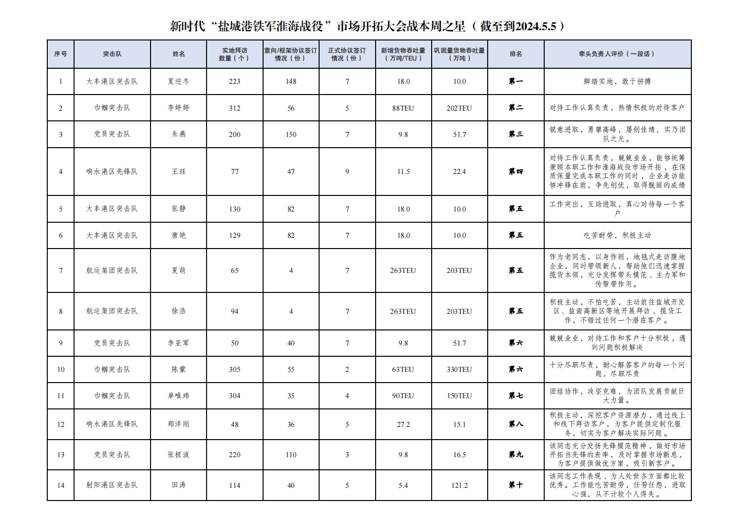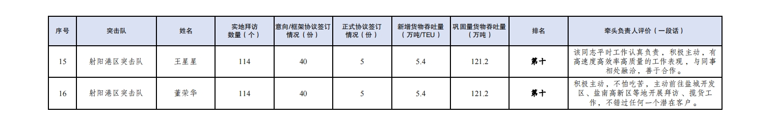第一名:大豐港區突擊隊 夏迎冬(拜訪客戶223家,簽訂意向協議148份,簽訂正式協議7份,新增貨物吞吐量18萬噸,鞏固量貨物吞吐量10萬噸);