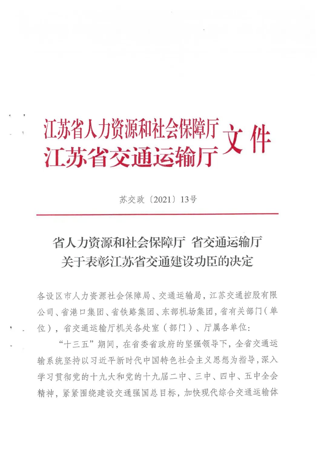近日,省人力資源和社會保障廳、省交通運輸廳印發《關于表彰江蘇省交通建設功臣的決定》,集團下屬響水港集團有限公司榮獲“江蘇省交通建設有功集體”表彰。