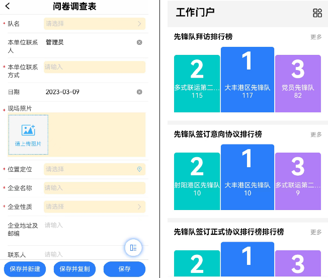 該系統(tǒng)集成了在線(xiàn)問(wèn)卷、定位打卡、成果評(píng)比、統(tǒng)計(jì)分析等功能。與傳統(tǒng)的紙質(zhì)問(wèn)卷相比,該系統(tǒng)減少了表格錄入、匯總上報(bào)、統(tǒng)計(jì)分析等環(huán)節(jié),實(shí)現(xiàn)了全過(guò)程無(wú)紙化、自動(dòng)化操作,極大地提高了工作效率。同時(shí),該系統(tǒng)還具備在線(xiàn)成果評(píng)比等功能,實(shí)時(shí)展現(xiàn)各先鋒隊(duì)工作成績(jī),為進(jìn)一步激發(fā)各先鋒隊(duì)你追我趕的戰(zhàn)斗激情提供了技術(shù)支撐。