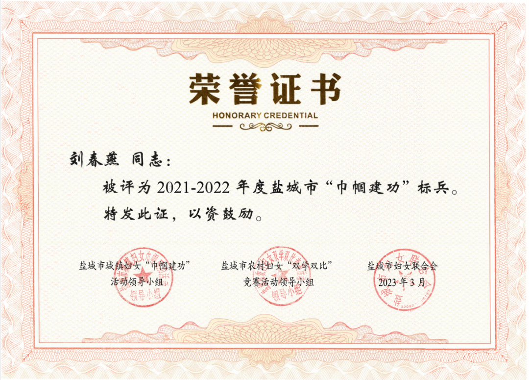 ????近日,市城鎮婦女“巾幗建功”活動領導小組、市農村婦女“雙學雙比”競賽活動領導小組、市婦女聯合會聯合發布《關于命名2021-2022年度全市城鄉婦女崗位建功先進集體(個人)的決定》,鹽城港智慧港口公司海燕班組榮獲“2021-2022年度鹽城市巾幗文明崗”榮譽稱號,鹽城港項目建設管理咨詢公司黨總支書記、執行董事、總經理劉春燕榮獲“2021-2022年度鹽城市巾幗建功標兵”榮譽稱號。