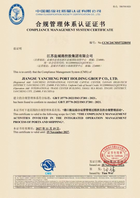 11月22日,鹽城港集團順利通過中國船級社質(zhì)量認證有限公司(CCSC)的合規(guī)管理體系審核認證,獲得合規(guī)管理體系認證證書,成為江蘇省首家獲得合規(guī)管理體系證書的港航企業(yè)。