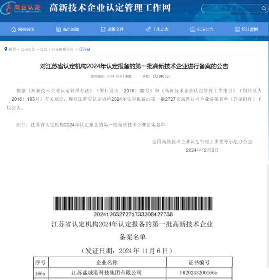 12月3日,鹽城港科技集團成功通過“高新技術(shù)企業(yè)”認定,提前一年完成國家高新技術(shù)企業(yè)認定的既定目標(biāo),標(biāo)志著鹽城港集團科技創(chuàng)新工作實現(xiàn)重大突破,邁入轉(zhuǎn)型升級新階段。