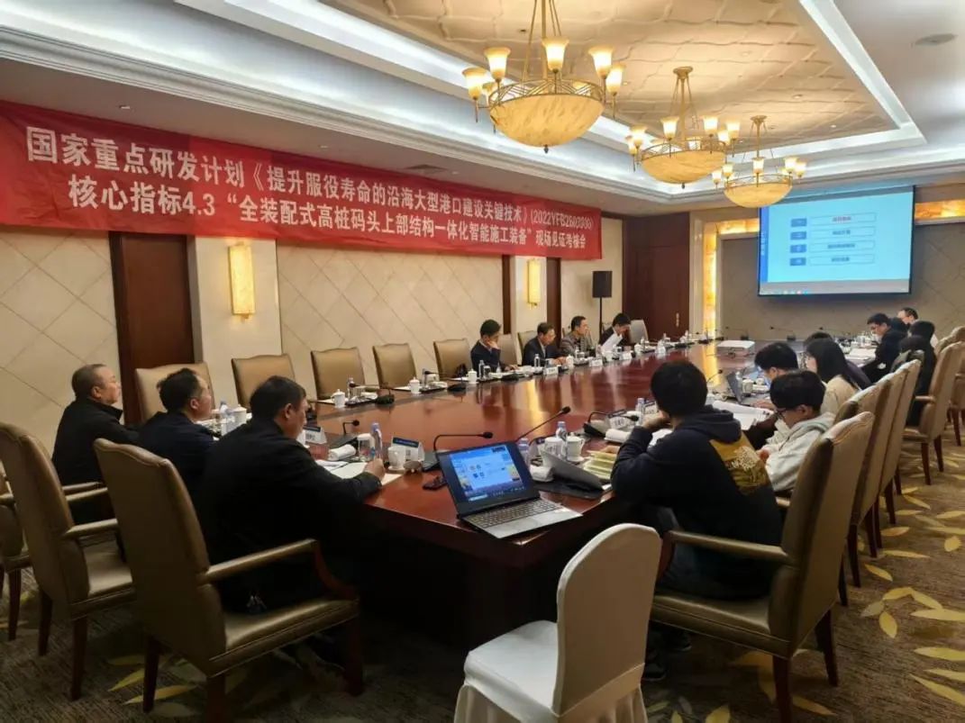 本工程位處大豐港區開敞海域,常年風浪大,最大潮差達到6米,漲落潮流急,傳統浮式起重船無法完成上部結構施工。為解決惡劣海況下碼頭上部結構快速安裝問題,為項目量身打造的智能筑港機,該設備配備了數字監控平臺,在安裝下放過程中,系統自動識別梁板安裝目標位置圖像后,將構件快速、平穩、精準落入,實現全過程智能安裝。全裝配式高樁碼頭上部結構一體化智能施工裝備是國家重點研發計劃項目的核心指標,趁此階段項目組組織召開了現場見證考核會,邀請來自鹽城市交通運輸局、鹽城市港航事業發展中心、鹽城市交通規劃設計院等單位的專家到現場進行見證考核,經過現場考察、會議審查及資料查閱,一致認為達到了考核指標要求,至此該裝備研發在此項目上的科技創新示范應用得到了有力的成功驗證。