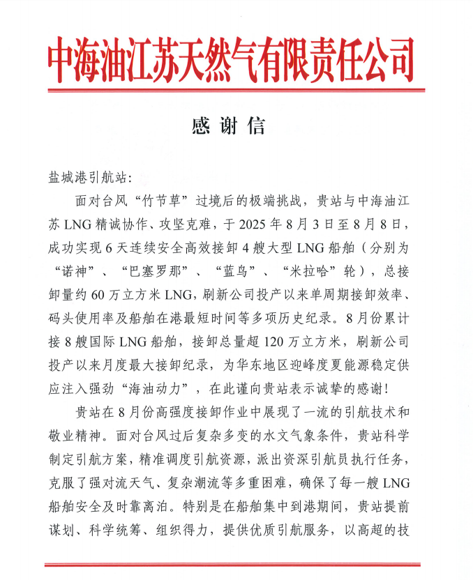 近日,鹽城港引航站收到中海油江蘇天然氣有限責任公司發(fā)來的感謝信。信中對引航站在臺風“竹節(jié)草”過境后的復雜局面下,高效完成LNG船舶接卸任務的專業(yè)服務予以高度認可,特別提及創(chuàng)下的多項紀錄,生動展現(xiàn)了引航站作為“水上國門”守護者,在區(qū)域能源供應中的硬核擔當。