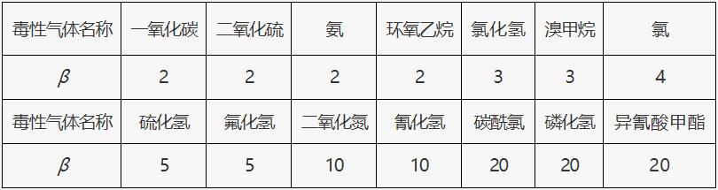 表1 常見毒性氣體校正系數β值取值表