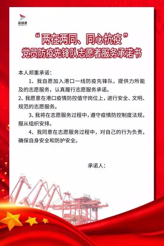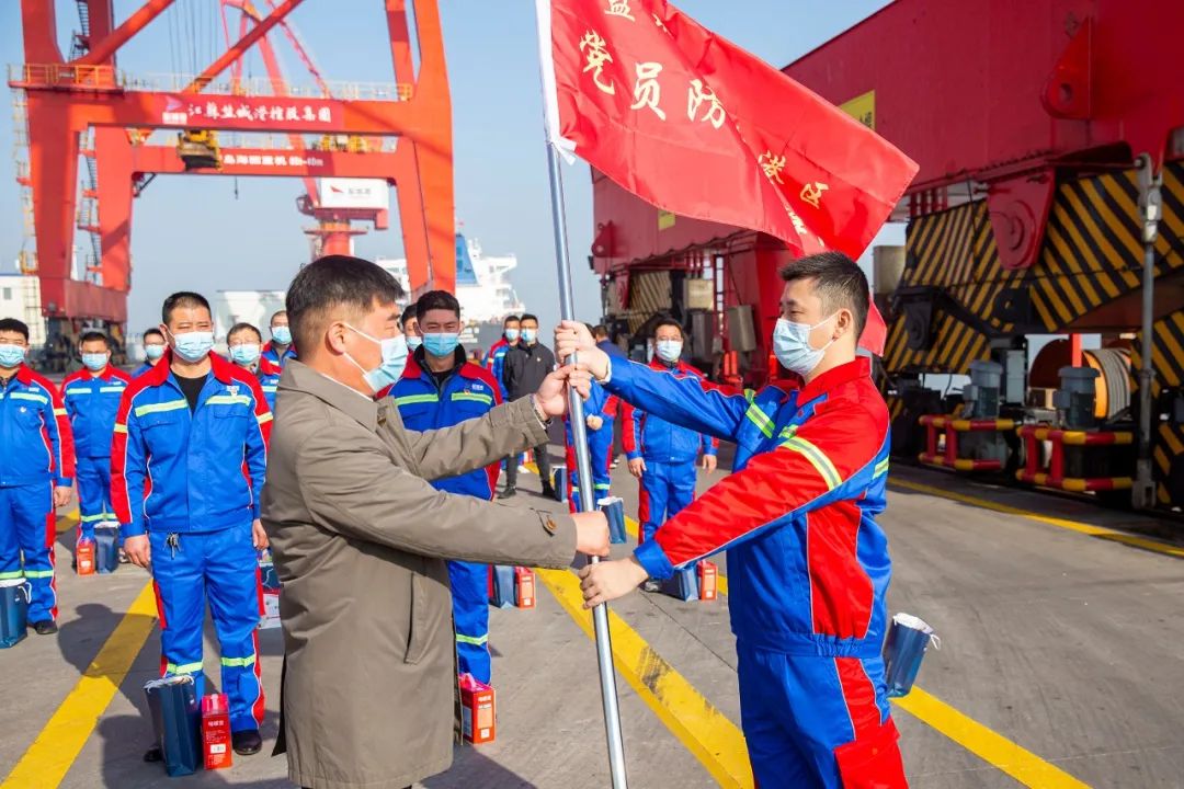 疾風(fēng)知?jiǎng)挪荩一鹨娬娼稹R咔榘l(fā)生以來,大豐港區(qū)迅速行動,先后成立“許鵬志愿隊(duì)”、“黨員志愿者”等隊(duì)伍,團(tuán)結(jié)帶領(lǐng)廣大黨員多次開展支援一線疫情防控工作和走訪慰問幫扶活動,使黨員干部成為團(tuán)結(jié)和帶領(lǐng)群眾戰(zhàn)勝疫情和各種困難的“先鋒隊(duì)”和“主心骨”。集裝箱碼頭平臺上,防疫先鋒隊(duì)隊(duì)長鄭重地接下“鹽城港大豐港區(qū)黨員防疫先鋒隊(duì)”鮮紅的旗幟,64名隊(duì)員依次簽署承諾書,并接受防控疫情崗前培訓(xùn),熟悉碼頭疫情防控相關(guān)知識,掌握疫情處理各項(xiàng)工作步驟。這支隊(duì)伍中,來自農(nóng)業(yè)科技公司的兩名女隊(duì)員獨(dú)具“靚”點(diǎn),她們舍小家為大家,積極投身到抗疫隊(duì)伍中,為碼頭防控一線注入了光彩奪目的“巾幗力量”。