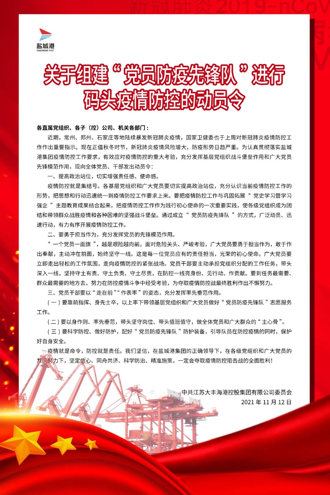 “我自愿加入港口一線黨員防疫先鋒隊(duì),提供力所能及的志愿服務(wù)……”11月15日,由大豐港區(qū)、航運(yùn)(集裝箱)集團(tuán)64名黨員組成的防疫先鋒隊(duì)向黨旗作出鄭重承諾。面對當(dāng)前疫情反復(fù)的形勢,鹽城港大豐港區(qū)積極響應(yīng)“兩在兩同””建新功行動號召,嚴(yán)格貫徹落實(shí)鹽城港集團(tuán)疫情防控工作要求,以“50天大比武”活動為契機(jī),充分發(fā)揮“我是黨員,向我看齊”的先鋒模范作用,讓黨旗飄揚(yáng)在疫情防控最前線,確保港口生產(chǎn)、防疫“兩手抓、兩不誤”。
