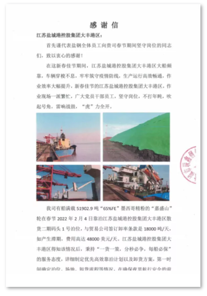 新年伊始,喜事連連。近日,鹽城港大豐港區(qū)港口公司收到鹽城市聯(lián)鑫鋼鐵有限公司送來的一封感謝信,對港口公司為客戶著想,以客戶至上,以一流專業(yè)的服務(wù)和生產(chǎn)組織能力、追求卓越的工作精神,高質(zhì)高效幫助客戶圓滿完成卸船任務(wù)表示由衷感謝。