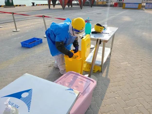 本次演練模擬了濱海港區(qū)通用碼頭2號泊位發(fā)現(xiàn)疫情之后的相關(guān)處置流程。演練中,碼頭發(fā)現(xiàn)疫情后,及時將情況進行上報,并立即停止作業(yè),同時迅速對登船人員進行排查,就地隔離,開展現(xiàn)場消殺工作?,F(xiàn)場成立疫情防控應急指揮部,按照指揮部的統(tǒng)一調(diào)度,開展應急處置,經(jīng)過妥善處理,演練中的疫情得到有效控制,同時對碼頭作業(yè)人員嚴格執(zhí)行“N+7+7”的閉環(huán)管理,確保濱海港區(qū)碼頭盡快恢復正常生產(chǎn)。