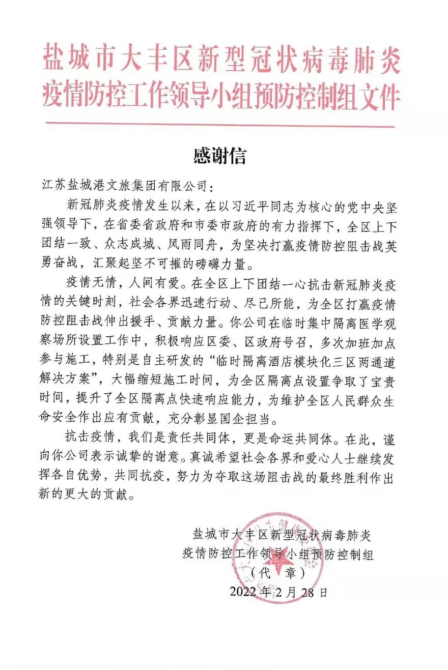 3月1日,大豐區(qū)疫情防控工作領(lǐng)導(dǎo)小組向鹽城港文旅集團(tuán)發(fā)來感謝信,對文旅集團(tuán)在設(shè)置隔疫情隔離點(diǎn)工作中,自主研發(fā)“臨時(shí)集中隔離醫(yī)學(xué)觀察場所模塊化‘三區(qū)’解決方案”,提升全區(qū)隔離點(diǎn)快速響應(yīng)能力所作出的貢獻(xiàn)表示感謝。