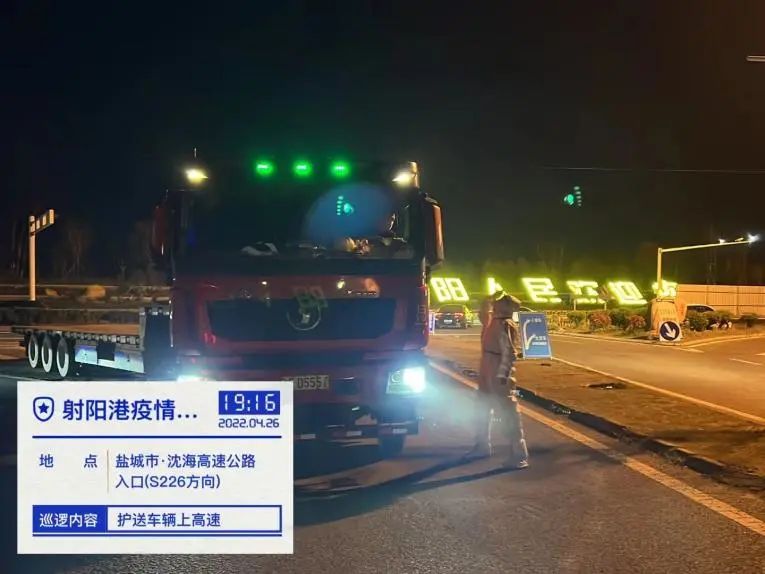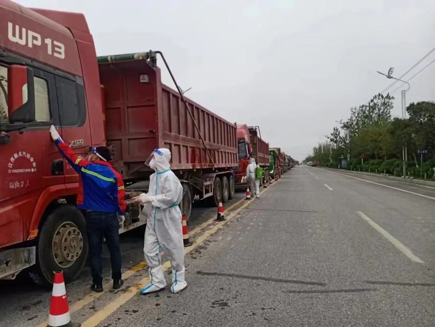 4月26日,接到客戶運輸車輛到達射陽高速出口檢查點,請求協(xié)助的電話后,港區(qū)立刻成立專項小組穿戴好防護服至高速口開展全程配套服務(wù),及時將運輸車輛引導(dǎo)到港區(qū)。