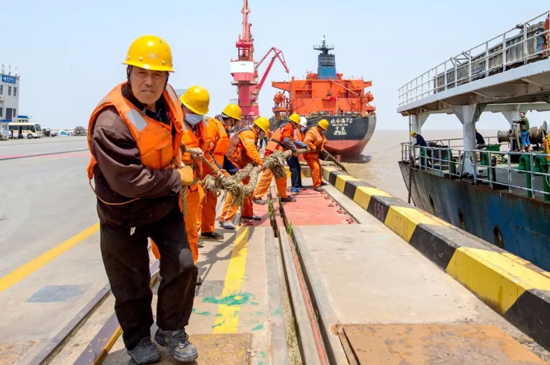 碼頭上,車來車往,裝船卸船,一片繁忙。一線員工們各司其職,熟練地操作著機械設備,現場作業井然有序。