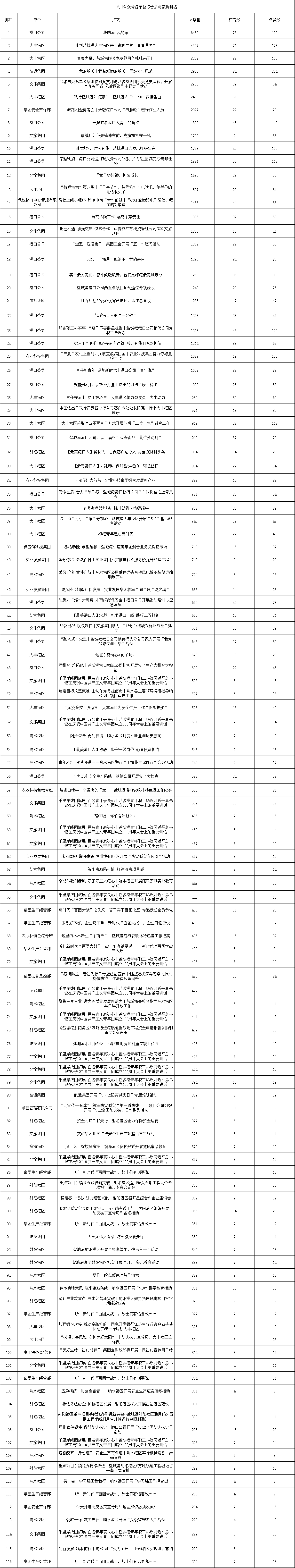 5月,集團微信公眾號共發布116篇文章??傮w閱讀數約9.5萬,各單位發稿更加活躍,希望大家保持一如既往的熱情,積極踴躍發稿,用最真實的數據,為集團沖刺“雙過半”貢獻文字力量。