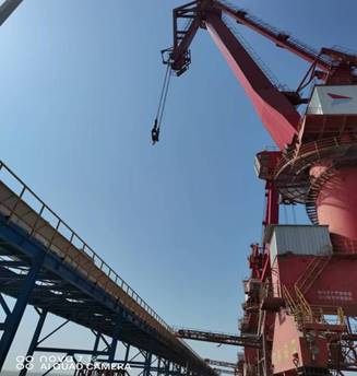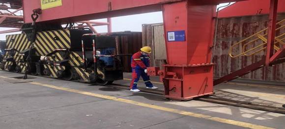 隨著一聲指令的下達,演練正式開始,糧食碼頭1#泊位“騰海明宇”輪作業(yè)過程中突然接上級通知,碼頭1小時后將突發(fā)強對流天氣,伴有雷電、大風、暴雨等緊急情況。現(xiàn)場調(diào)度立即啟動突發(fā)極端天氣機械設備防風錨定應急預案,門機停止作業(yè)、抓斗降至碼頭面、更換鉤頭、放下行走錨定,保障人員拉起門機防風拉索、安全巡查員對各處防風錨定情況進行再檢查、作業(yè)車輛就地停車并開啟雙閃、設備維護組人員全部保持待命搶修狀態(tài)。在場人員分工明確、各司其職、井然有序,僅用10分鐘,所有機械錨定任務全部完成,所有作業(yè)人員撤離到安全區(qū)域進行復盤點評,演練圓滿結(jié)束。