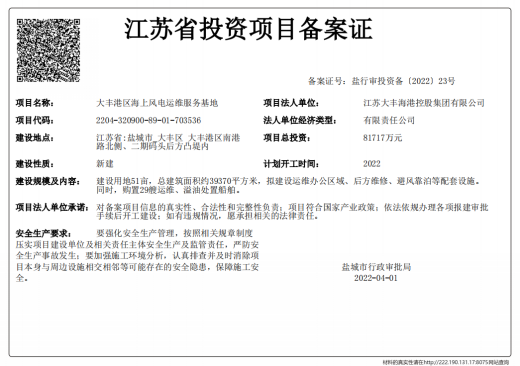 鹽城港大豐港區(qū)海上風(fēng)電運(yùn)維服務(wù)基地項(xiàng)目為市城鄉(xiāng)建設(shè)重點(diǎn)房建項(xiàng)目之一,位于大豐港區(qū)南港路北側(cè)、物聯(lián)大廈東側(cè),二期碼頭后方凸堤內(nèi),建設(shè)用地51畝,建筑面積約39370㎡,項(xiàng)目總投資81717萬元,擬建設(shè)運(yùn)維辦公區(qū)、維修車間、安全培訓(xùn)中心等,后期部分建設(shè)避風(fēng)靠泊等配套設(shè)施;同時(shí)購置29艘運(yùn)維、溢油處置船舶,通過建立運(yùn)維基地,統(tǒng)一運(yùn)維,打造專業(yè)運(yùn)維隊(duì)伍,共享運(yùn)維配套資源及數(shù)據(jù),降低鹽城地區(qū)各個(gè)海上風(fēng)電的運(yùn)維成本,促進(jìn)海上風(fēng)電高效運(yùn)行,帶動(dòng)風(fēng)電產(chǎn)業(yè)鏈的發(fā)展。