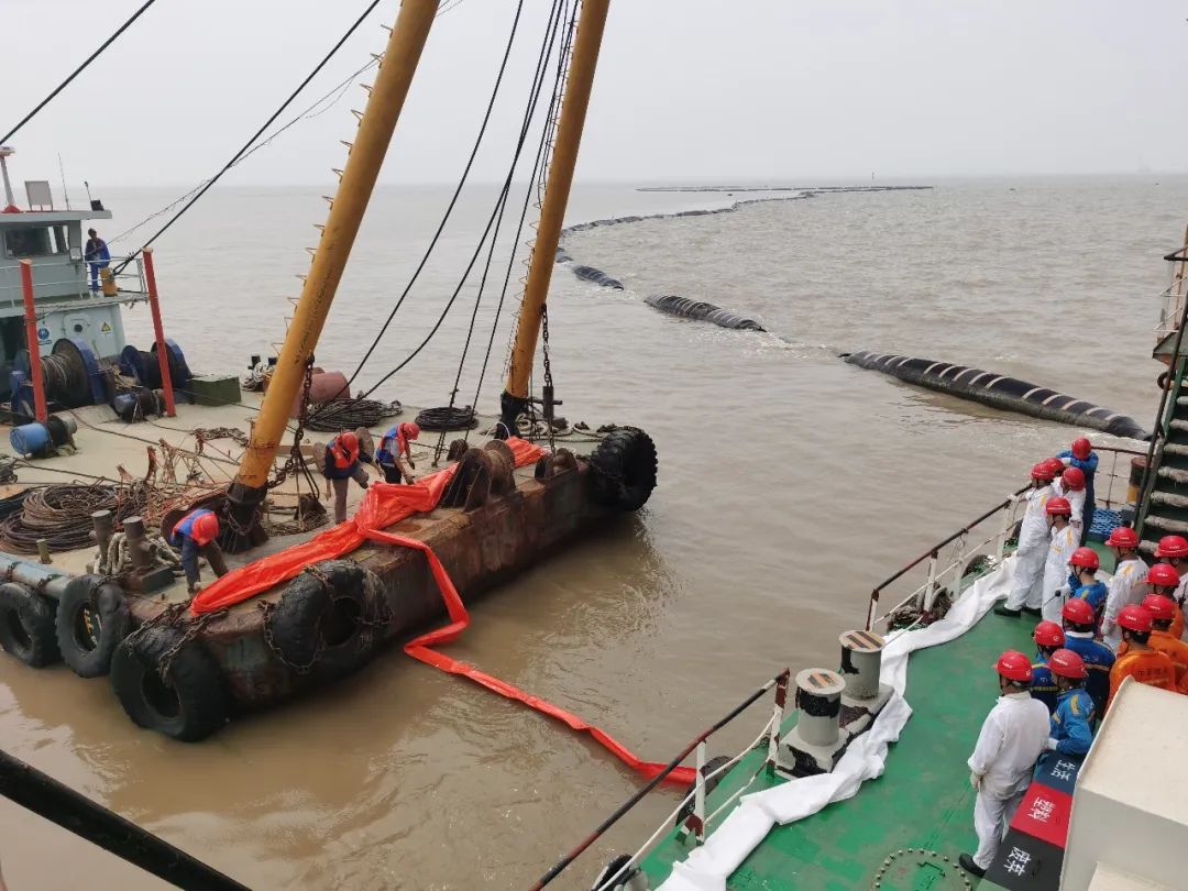 隨后,溢油演習正式開始,“左舷船中錨機壓管漏油啦!”“新海鯉”輪船長接報后立即拉響了防油污警報,同時船長通過全船廣播告知溢油地點,根據應變部署要求,立即切斷漏油源頭,控制油污流入海面,清理甲板現場污油。同時上報施工項目部,項目部組織“航工301”、“茸洋168”、“海盛189”輪立即趕赴灌河口航道轉運點參與新海鯉輪的水面油污清理工作,通過各輪齊心協作,成功完成清污工作。