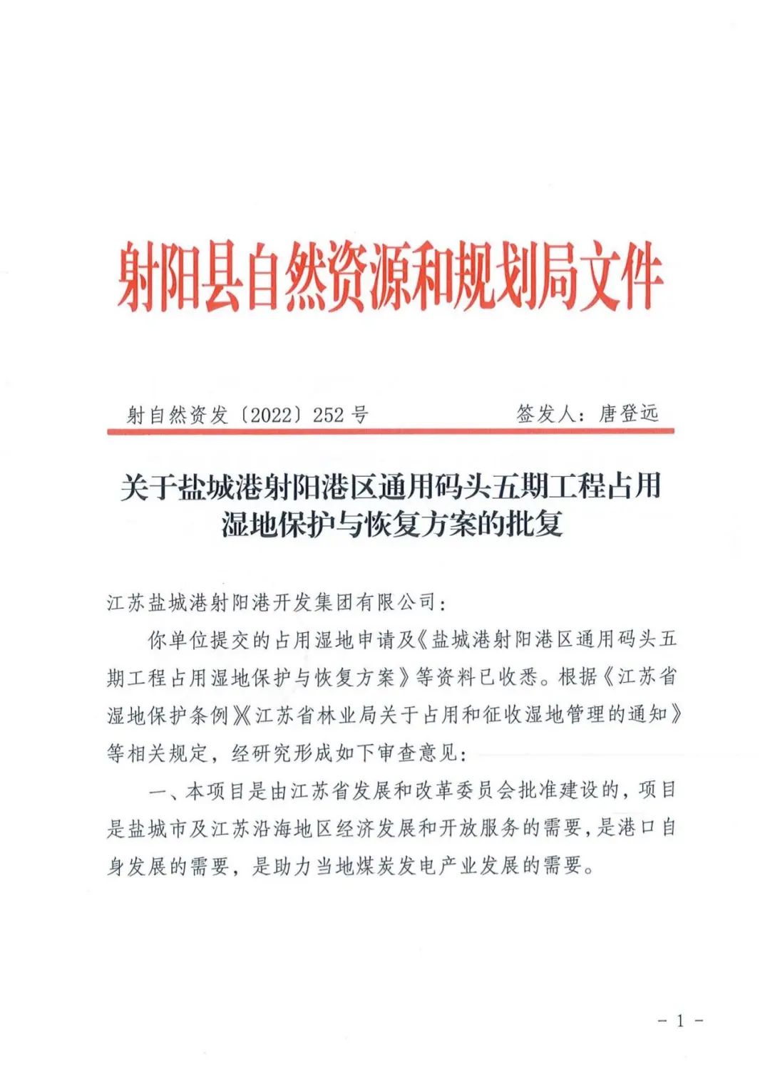 10月25日,鹽城港射陽港區通用碼頭五期工程占用濕地保護與恢復方案取得射陽縣自然資源和規劃局正式批復,至此,該項目已完成包括備案、穩評、岸線批復等多項前期手續辦理,為加快推進該項目的正式開工奠定了堅實基礎。