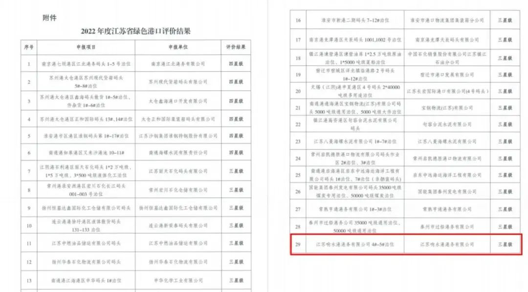 12月21日,2022年度江蘇省綠色港口評價結(jié)果揭曉,江蘇響水港港務有限公司4#-5#泊位獲得“江蘇省三星級綠色港口”榮譽稱號。