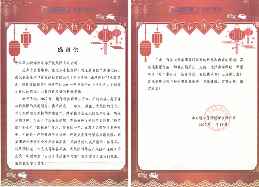 新歲序開,同赴新程。近日,集團下屬江蘇鹽城港大豐港開發(fā)集團、江蘇鹽城港港口公司、江蘇鹽城港航運集團三家單位分別收到來自山東港口保險經(jīng)紀(jì)公司的感謝信。紙短情長,字字暖心。一封封感謝信,道出了鹽城港和山東港攜手發(fā)展的深厚情誼。