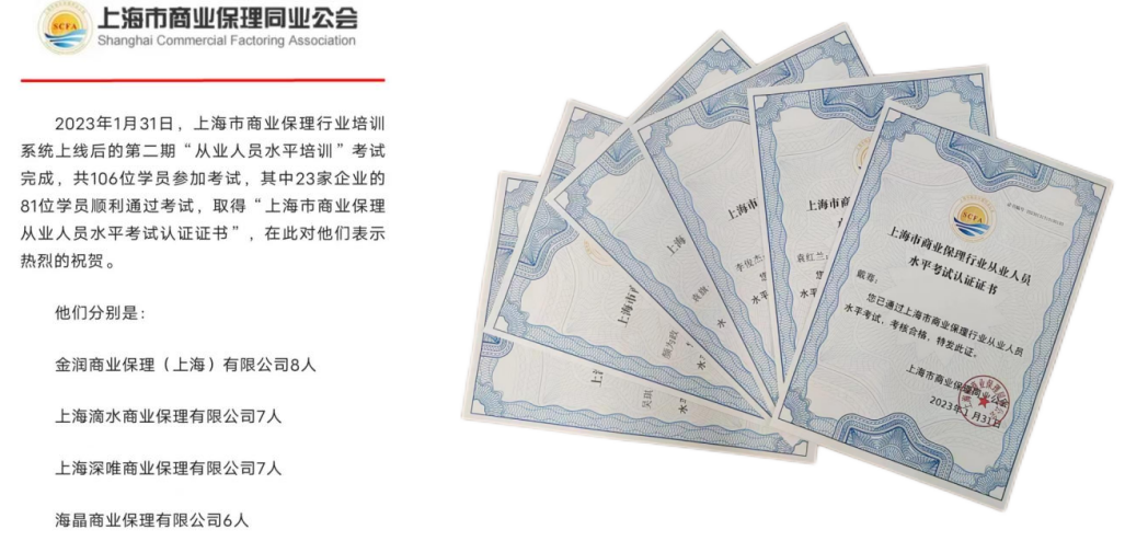 近日,海晶商業(yè)保理有限公司6名員工參加上海市商業(yè)保理水平培訓(xùn),順利通過考試并取得認證證書。考試通過人次在上海市商業(yè)保理行業(yè)名列前茅,充分展示了出色的專業(yè)水準(zhǔn)。