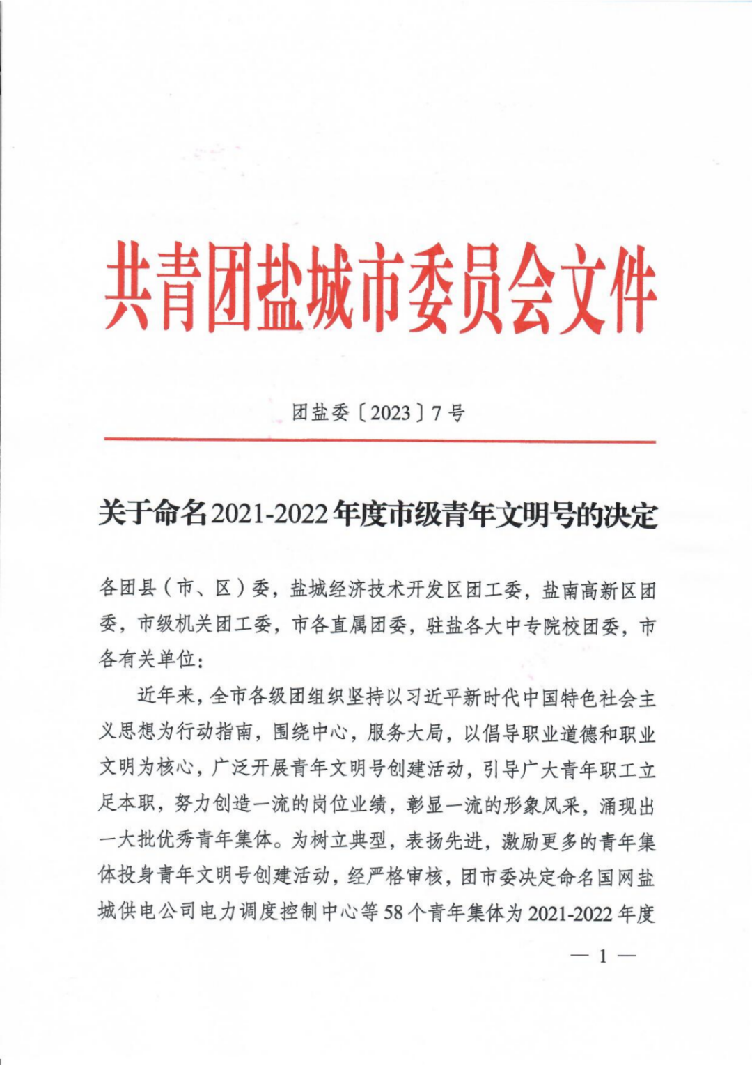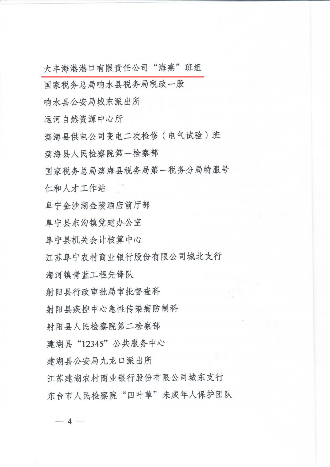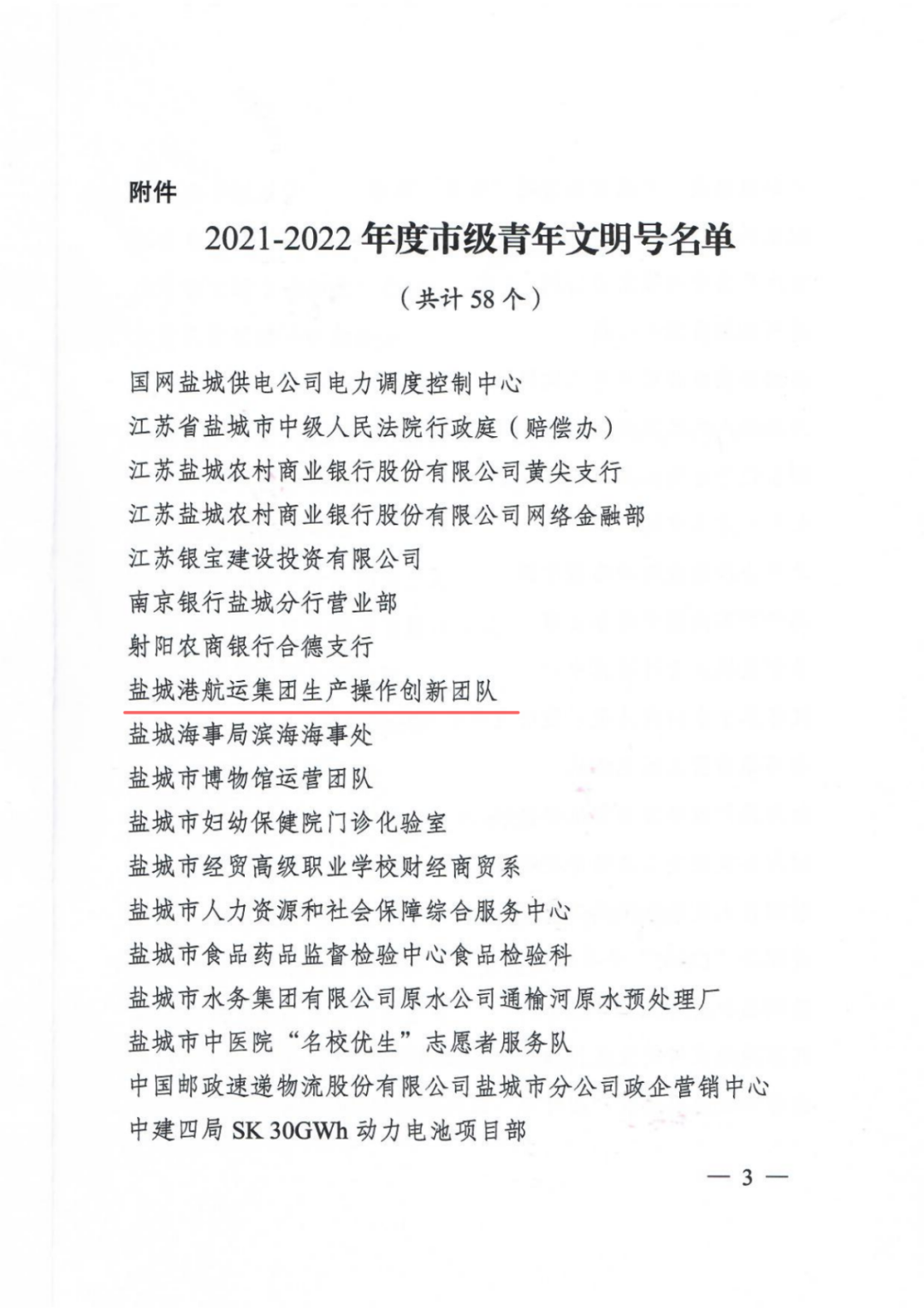 近日,共青團鹽城市委發(fā)布《關于命名2021-2022年度市級青年文明號的決定》,鹽城港航運集團生產操作創(chuàng)新團隊、大豐海港港口有限責任公司“海燕”班組以優(yōu)異的表現榮獲“2021-2022年度市級青年文明號”稱號。