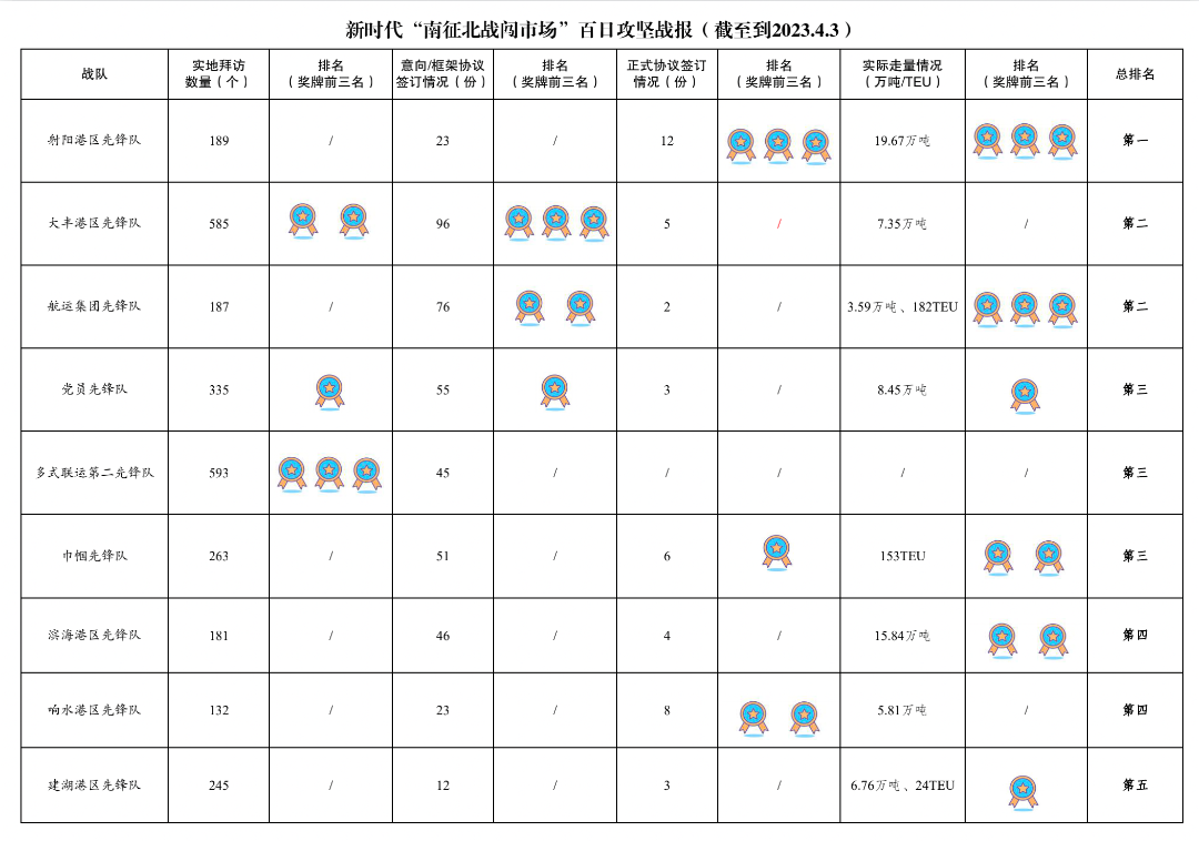 2.簽訂意向/框架協議數量473份:其中大豐港區先鋒隊96份,航運集團先鋒隊76份,黨員先鋒隊55份,巾幗先鋒隊51份,濱海港區先鋒隊46份,多式聯運第二先鋒隊45份,多式聯運第一先鋒隊33份,射陽港區先鋒隊23份,響水港區先鋒隊23份,青年先鋒隊13份,建湖港區先鋒隊12份。