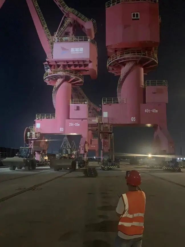 “5#門機入軌正?!薄靶凶邫C構壓輪正?!薄盎剞D、起升、變幅機構運行正?!彪S著現場指揮員對講機里傳來各機構一切正常運行的報告,經過10個晝夜的連續奮戰,鹽城港射陽港區碼頭門機移位作業宣告完美收官。