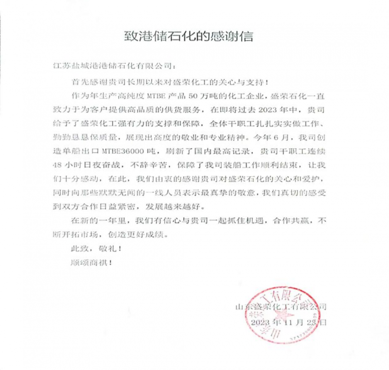 今年以來(lái)港儲(chǔ)石化公司全體干部職工堅(jiān)持以“時(shí)間就是金錢,程序體現(xiàn)規(guī)矩,質(zhì)量鑄就精品,效率就是生命”為宗旨,不斷提升服務(wù)品質(zhì)及工作效率,獲得了客戶的贊賞與肯定。近期,合作客戶山東玉皇盛榮化工寄來(lái)一封感謝信,信中內(nèi)容充分肯定了港儲(chǔ)石化的服務(wù)品質(zhì),并由衷地表達(dá)了感謝。