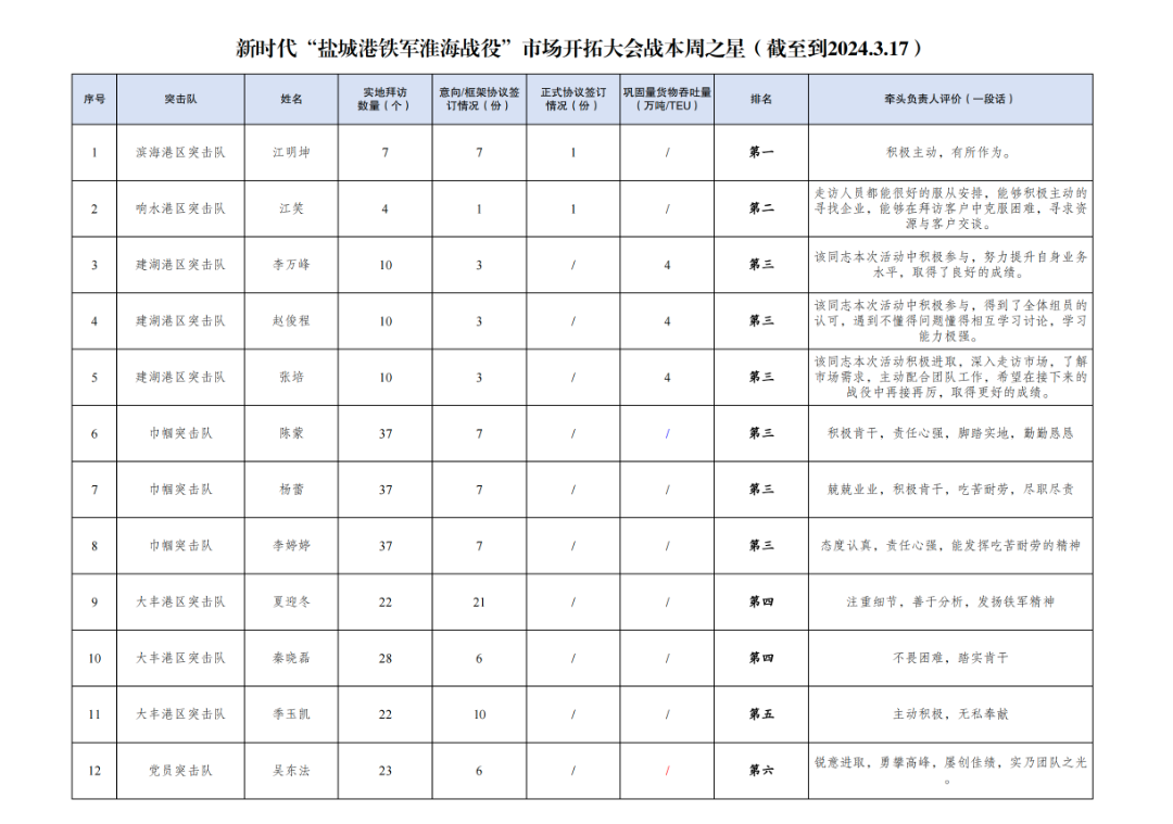 2.簽訂意向協議數量147份:其中大豐港區突擊隊56份,黨員突擊隊21份,響水港區突擊隊19份,濱海港區突擊隊11份,巾幗突擊隊9份,射陽港區突擊隊6份,航運集團突擊隊5份,亭湖港區突擊隊5份,建湖港區突擊隊5份,多式聯運第一突擊隊5份,多式聯運第二突擊隊3份,阜寧港區突擊隊2份。