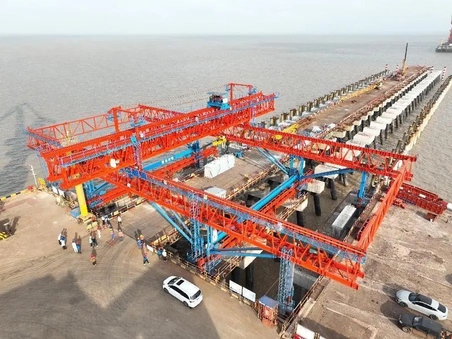 不僅如此,筑港機還進行了智能化改造升級,配備了數字監控平臺。在安裝下放過程中,通過系統精準掌控構件姿態并自動調位。系統自動識別梁板安裝目標位置圖像后,將構件快速、平穩、精準落入,實現全過程智能安裝。一跨的“積木”拼裝完成后,再自動前行、過跨,進行下一跨安裝,施工效率和安裝精度大幅提升,現場作業人員和設備投入大大減少。