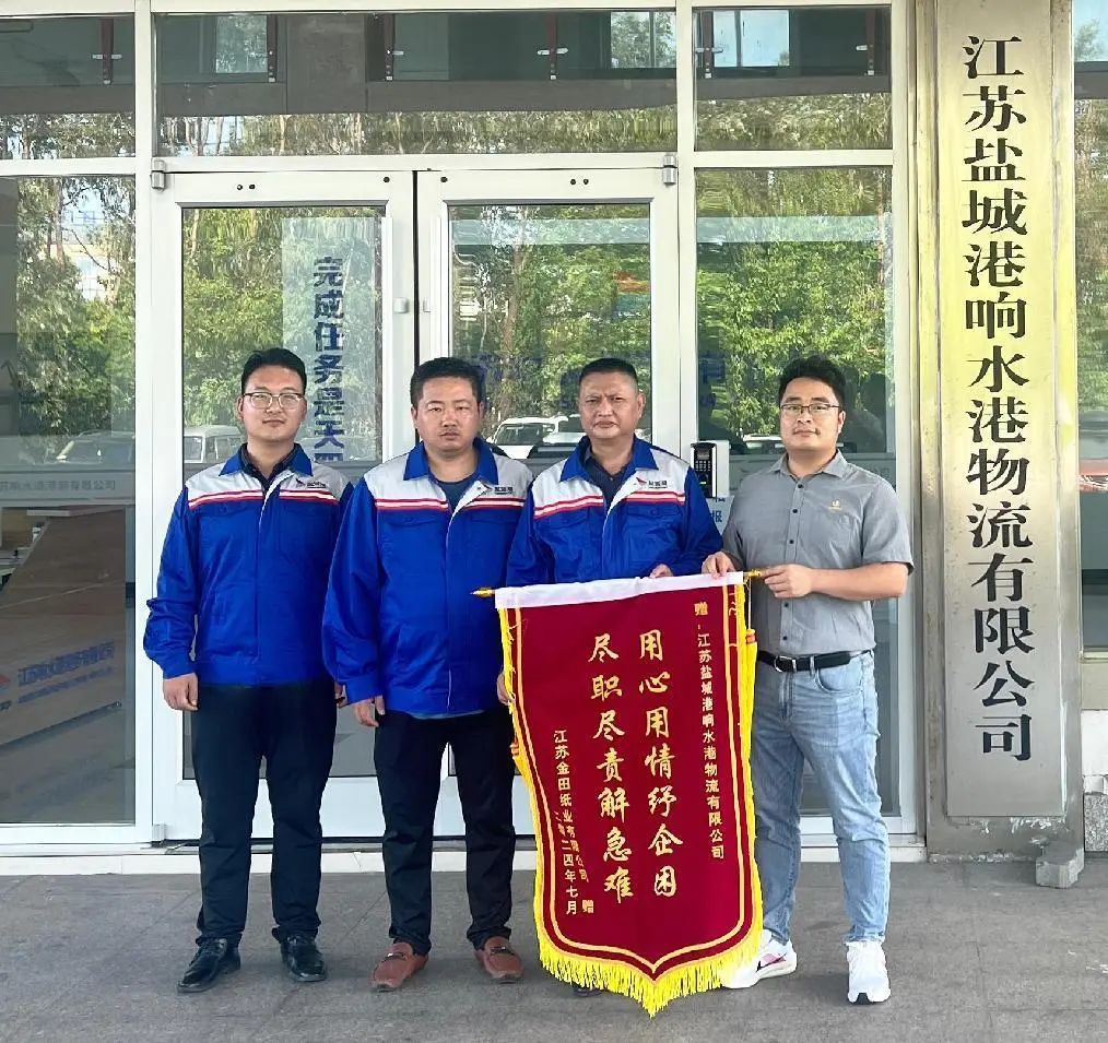 近日,鹽城港響水港區物流公司收到江蘇金田紙業有限公司贈送的“用心用情紓企困 盡職盡責解急難”錦旗,來表達對港區在成品紙運輸期間優質服務的認可和感激之情。