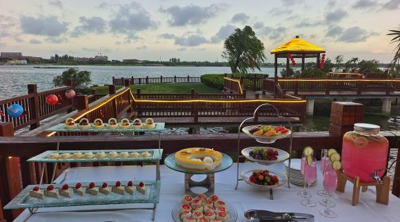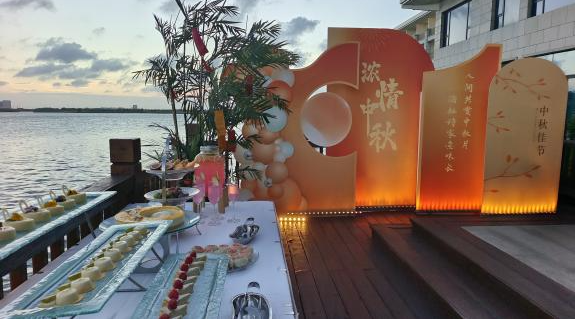 金秋戶外賞月活動現場,酒店精心布置了日月湖畔中庭區域,如嫦娥奔月的壁畫、玉兔造型的擺件等,綢緞臺面上擺滿了各種精致的月餅、新鮮的水果和香醇的茶點,周圍點綴著璀璨的燈光,處處洋溢著濃厚的節日氛圍。現場的小游戲環節,顧客們踴躍參加,更是將整個活動氛圍推向了高潮。