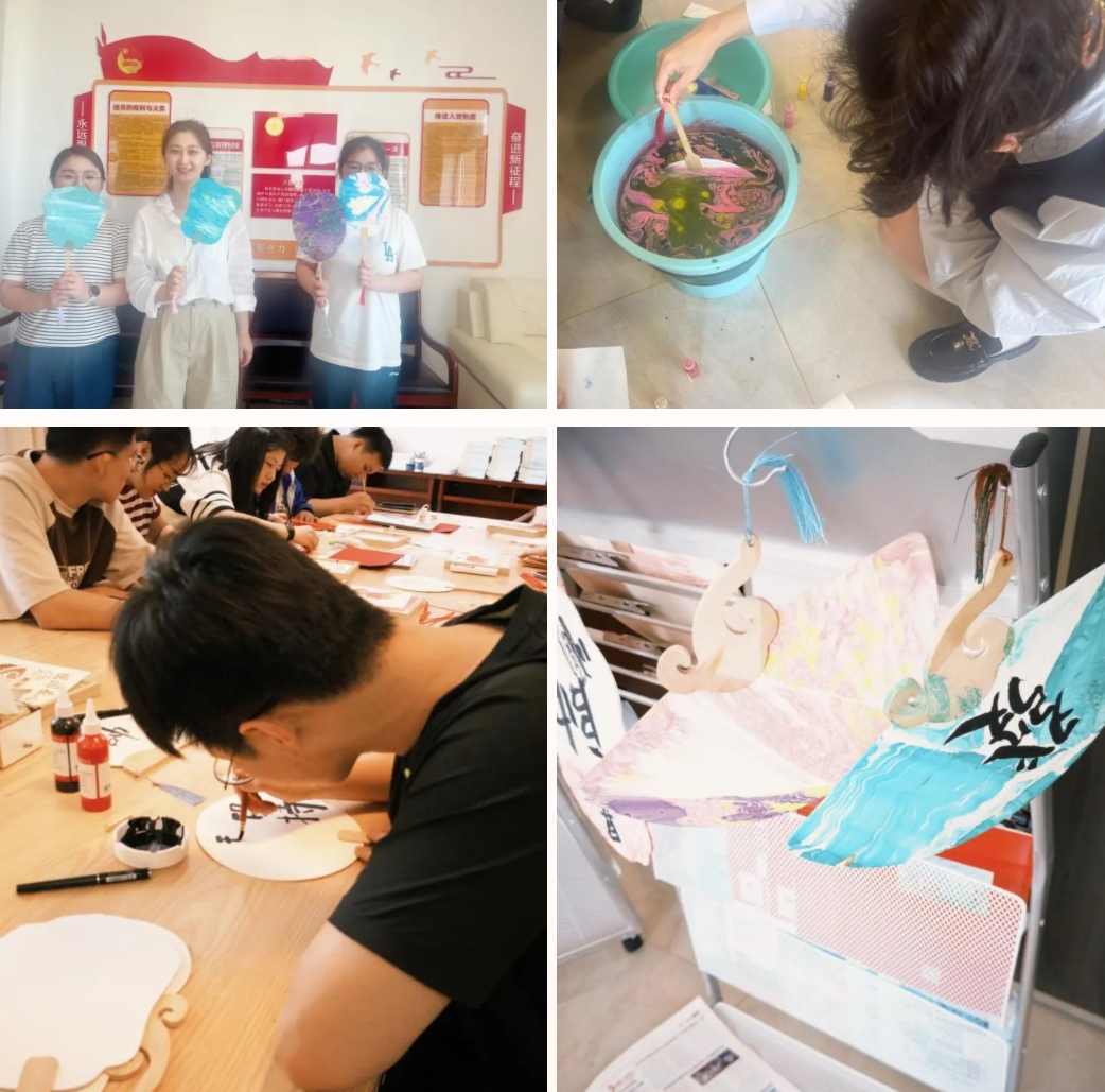 為青年們講述了漆扇的悠久歷史與在華夏藝術殿堂中璀璨奪目的地位,示范了漆扇制作那繁復而精妙的步驟,從選材到上漆,每一步都透露著對美的極致追求。活動中,青年們充分發揮創意與想象,將精心調配的顏料緩緩滴入清澈的水中,隨后以輕盈的手法攪動水面,顏料在水中緩緩擴散,形成一幅幅流動的畫卷,或清新淡雅,或濃墨重彩,那流云般變幻莫測的紋理,是自然與藝術的完美邂逅,更是青年們傳達著對祖國的愛意。