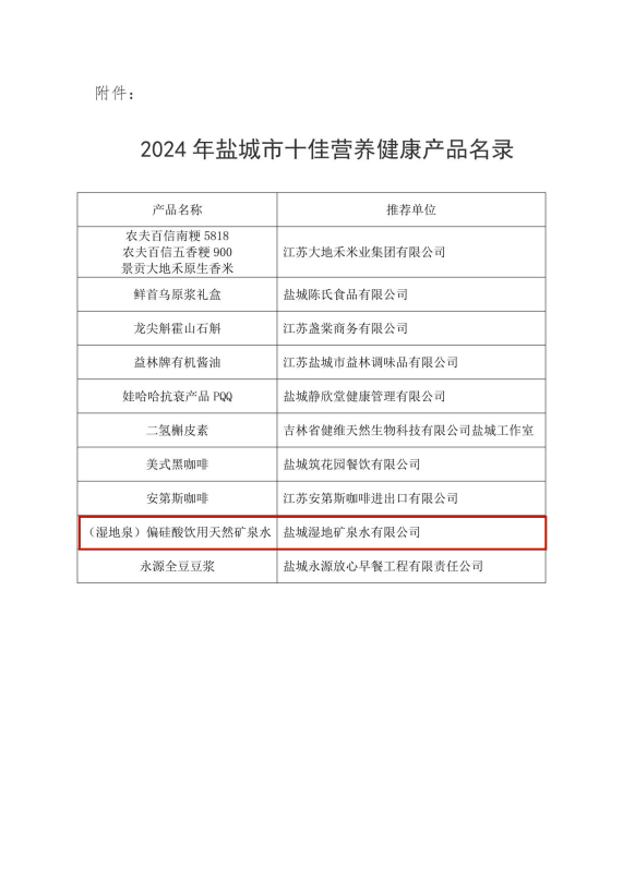 近日,鹽城市十佳營(yíng)養(yǎng)健康產(chǎn)品評(píng)選結(jié)果出爐,鹽城濕地礦泉水有限公司“濕地泉”系列偏硅酸飲用天然礦泉水榮獲2024年鹽城市十佳營(yíng)養(yǎng)健康產(chǎn)品稱號(hào)。