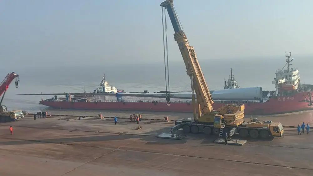 在吊裝作業現場,400噸、500噸、80噸汽車吊各一臺嚴陣以待。在專業人員的精準指揮下,各吊車默契配合,經過數小時的緊張作業,成功將葉片從船上運至指定存放區域。