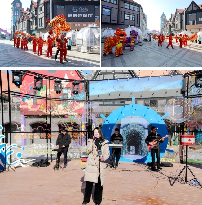 一踏入莎士比亞商貿(mào)小鎮(zhèn),港泊系列餐飲門店、跨境電商門店都洋溢著濃濃的年味。紅燈籠高高懸掛,彩旗隨風(fēng)飄揚(yáng),喜慶的對聯(lián)貼滿門窗,瞬間將人們帶入春節(jié)的喜慶氛圍中。舞龍舞獅表演無疑是小鎮(zhèn)的重頭戲,廣場上,舞龍?jiān)跓艋鸬挠痴障买暄盐鑴樱碜顺C健,色彩斑斕,時而騰空而起,時而盤旋游走,氣勢磅礴,引得觀眾陣陣驚呼。舞獅表演同樣精彩絕倫,獅子們眼神靈動,表情豐富,時而翻滾跳躍,時而嬉戲玩耍,為觀眾帶來無盡的歡樂與好運(yùn)。