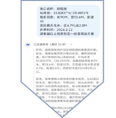 Deep Seek的角色扮演,弱化被動模式,強化主動賦能。“以往的船舶靠離泊模式主要依賴于我們調度員的經驗判斷,容易陷入被動應對的局面。”現場調度員展示應用成果時說,“通過向Deep SeekAI發送數據指令進行實時信息分析,成功弱化了這種被動模式。它能夠根據天氣、潮汐和貨物類型等多維度思考,按照泊位選擇、安全措施、人員配置制定靠、離泊作業模型,我們就按圖索驥,確保了整個流程的有序性和高效性。”