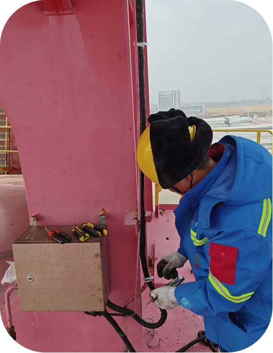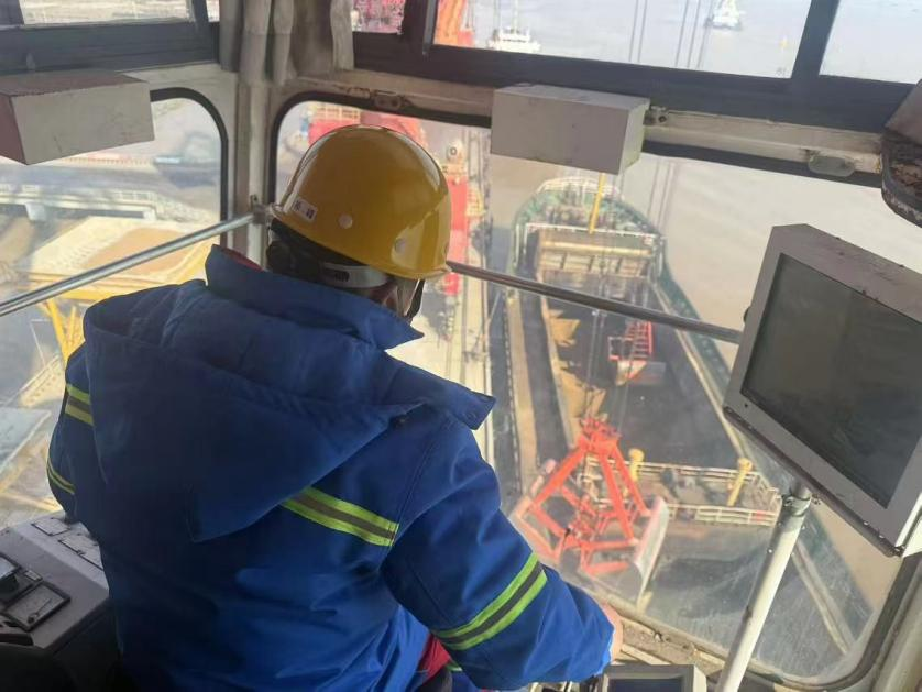 他攀至高聳門機頂端,低頭細致檢查設備,專注各部件運行健康狀況。每一次低頭,都是對設備安全的守護。