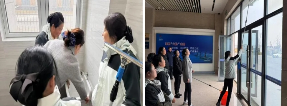 培訓現(xiàn)場圍繞重點區(qū)域清潔、保潔工具使用技巧、保潔頻次和保潔規(guī)范等方面,采用現(xiàn)場教、實地訓的方式,詳盡重點,確保每位保潔員都能將作業(yè)技巧、標準要求了然于心。實操中,保潔組全員化身“清潔奇兵”,各司其職,嚴格按規(guī)范操作,以日常保潔、深度清潔、機制清潔的高標準,為港區(qū)營造了干凈、整潔的工作環(huán)境。