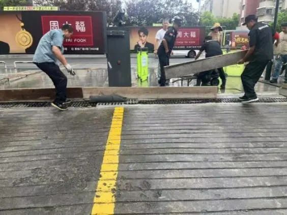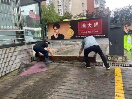 隨著防汛警報響起,物業應急小組迅速集結,攜帶防汛沙袋、防洪插板、抽水泵等物資設備趕赴西大門。各小組按照預案分工展開作業:搶險救援組兵分兩路,第一分隊使用專業工具快速搬運并組裝鋁合金防洪插板,在車庫入口處構筑起臨時擋水墻;第二分隊緊隨其后,用沙袋在插板后方疊筑“品”字形防洪墻,每層沙袋間用防水布加固,確保無滲漏縫隙。設備保障組同步啟動移動式抽水泵,對積水區域實施強排作業,同時安排技術人員對故障排水系統進行緊急搶修。全程通過智能廣播系統循環播放疏散提示,引導周邊居民有序撤離至臨時安置點。
