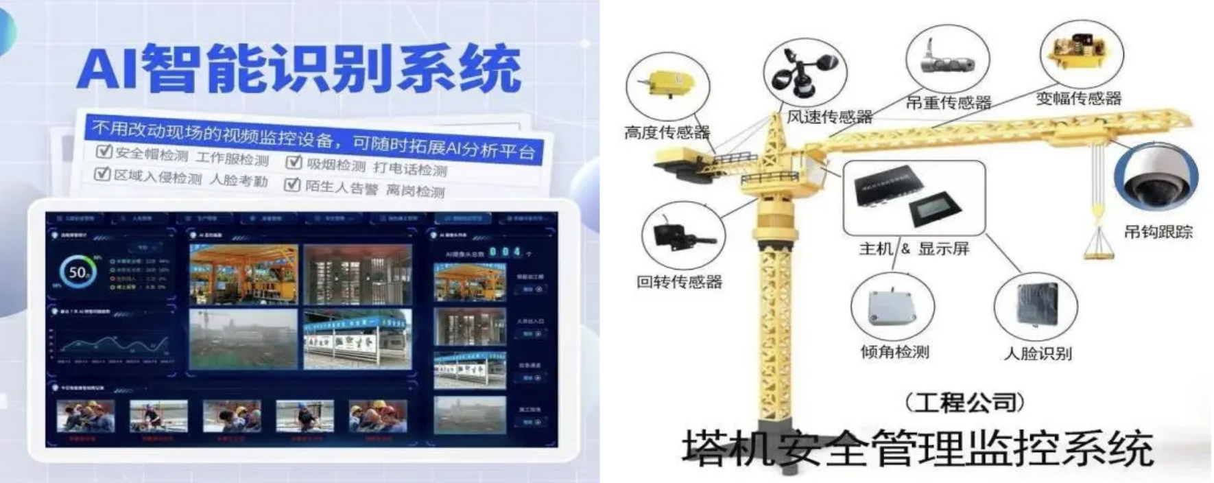 傾力建設“智慧工地”,以數字化手段重塑安全管理模式,實現從“人防”到“技防”的跨越升級。AI智能識別系統、塔吊安全監測和環境智控聯動這三款高科技系統,不僅能實時捕捉未戴安全帽、高空作業無防護、危險區域闖入等行為,還能瞬間告警、即時處置,通過實時感知PM2.5與噪聲數據,超標即觸發自動噴淋,守護員工健康與綠色施工。