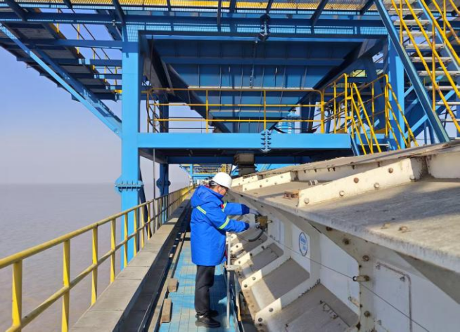 寒冬的晨霧還未散盡,陳濤正俯身蜷縮在狹小空間里,滿手油污的指尖精準對接著老化油管,他的額角滲著細汗,眼神卻專注如尺,每一次扳手轉動都力道均勻,仿佛在完成一場精密的外科手術。“這臺設備承擔著糧食轉運的關鍵任務,油管老化漏一滴油,都可能耽誤整船貨的周轉。”他頭也不抬地說著,手邊的工具包敞開著,扳手、螺絲刀的金屬表面泛著溫潤光澤,那是十年如一日的打磨,刻下的不僅是使用痕跡,更是與鋼鐵的默契。在碼頭上,陳濤是公認的設備醫生,大到正面吊機的液壓系統,小到輸送設備的一顆螺帽,他都了如指掌。今年汛期,一臺門機突然卡殼,若不及時修復,整船糧食可能受潮變質。陳濤帶著班組連續奮戰3小時,跪在泥濘里排查線路、更換零件,直到設備重新運轉。