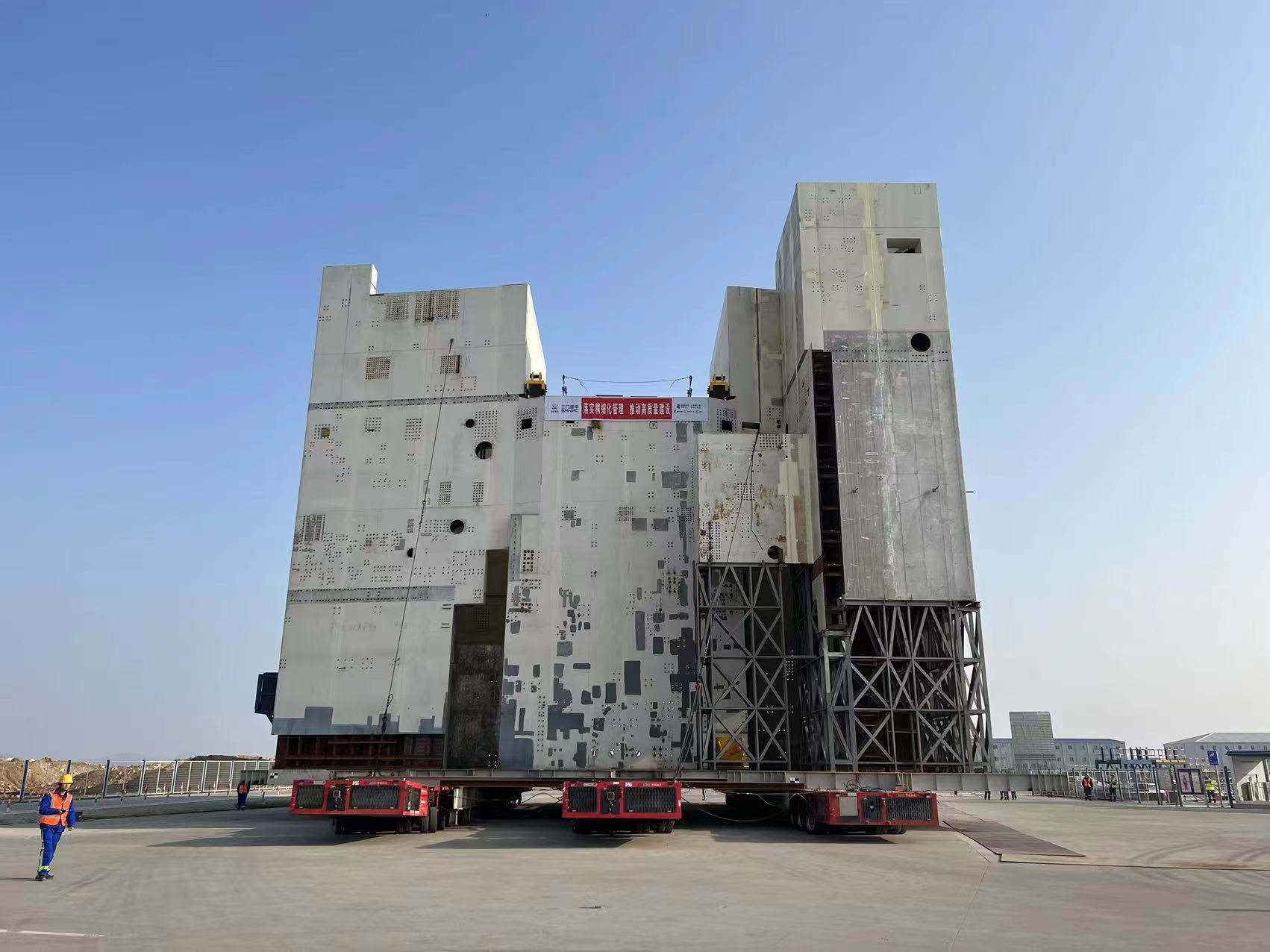 自行式模塊運輸車整車寬3m,由4套動力模塊單元、8臺模塊單元車以及并車所需附件組合而成,共56軸線。此車配備了液壓驅(qū)動、液壓升降、液壓轉(zhuǎn)向的特種車輛,運輸車整體長度可根據(jù)貨物裝載的需要,可將動力車組進行自由拼接,聯(lián)動作業(yè),可實現(xiàn)同步前進、倒退、原地轉(zhuǎn)向、水平移動,堪稱中國版“變形金剛”。此自行式模塊運輸車曾參加過國慶閱兵、三門核電設備運輸?shù)却笮突顒印?/p>