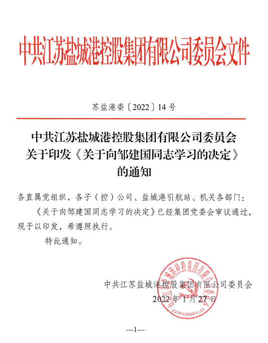 鄒建國同志與病魔抗爭多年,直到生命的最后時刻,仍然奮戰在引航抗疫第一線,充分詮釋了鹽城港人勇敢無畏的優良品質,生動展現了引航老兵忠于黨的精神風貌,是鹽城港航事業的杰出代表,為鹽城港人樹立了奮勇向前的時代榜樣。為深入學習鄒建國同志先進事跡,切實弘揚時代英模精神,激勵廣大黨員干部胸懷理想、堅定信念,恪盡職守、無私奉獻,經鹽城港集團黨委研究決定,在全系統開展向鄒建國同志學習的活動。