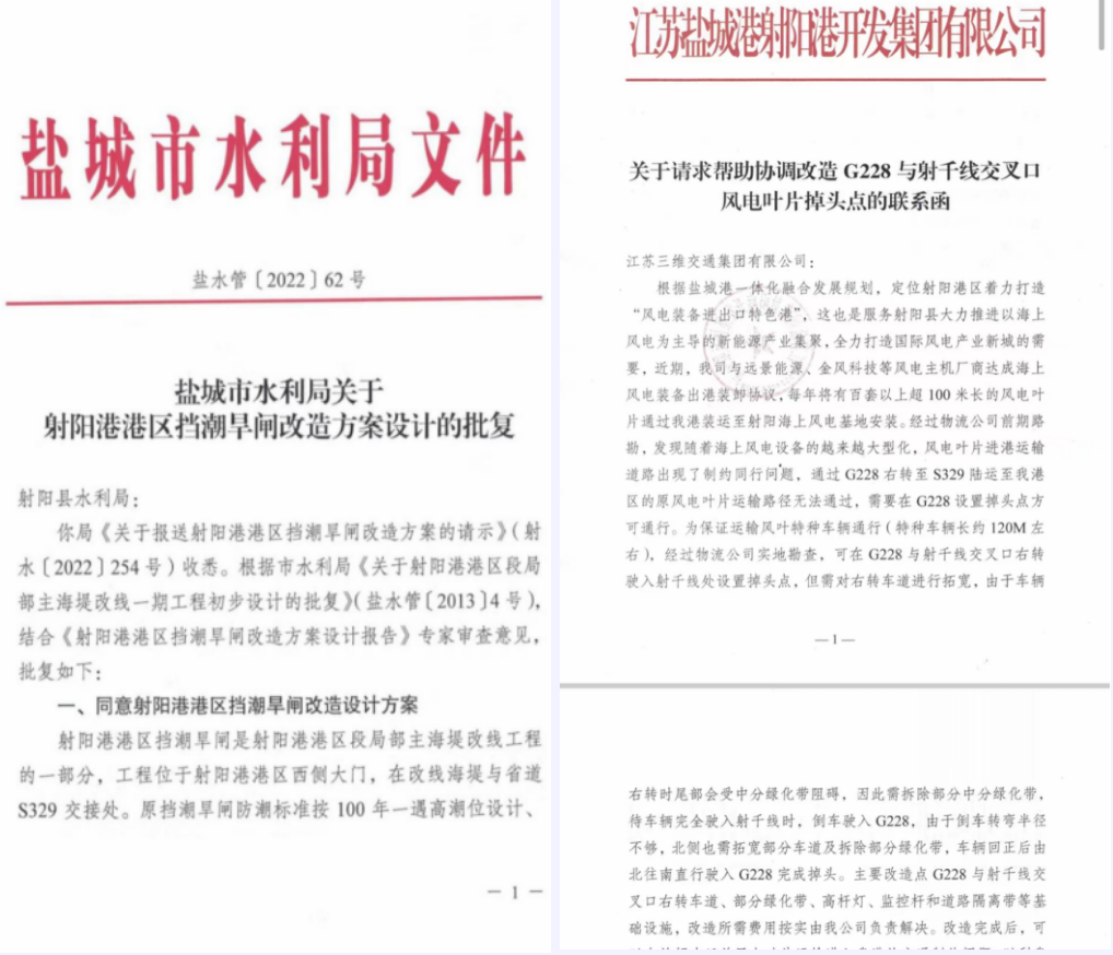 射陽港區(qū)在風(fēng)電業(yè)務(wù)市場調(diào)研拜訪客戶時(shí)發(fā)現(xiàn),隨著海上風(fēng)電設(shè)備大型化發(fā)展趨勢,120米以上風(fēng)電葉片運(yùn)輸在S329和G228的進(jìn)射陽港交匯處,受道路限高、轉(zhuǎn)彎半徑小等影響,葉片運(yùn)輸不能安全通過,存在運(yùn)輸堵點(diǎn);同時(shí)還發(fā)現(xiàn),射陽龍?jiān)春I巷L(fēng)電場項(xiàng)目采用的遠(yuǎn)景能源8.5MW主機(jī)寬度在8米以上,而射陽港區(qū)S329進(jìn)港道路上的擋潮旱閘,位于道路中間位置且建有混凝土中墩,導(dǎo)致通行寬度不足8米,成為又一運(yùn)輸堵點(diǎn)。